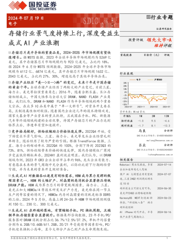 【国投证券】【20240720】2024年07月20日更新-【国投证券】电子行业专题-存储行业景气度持续上行-深度受益生成式AI产业浪潮-37页 行业研究