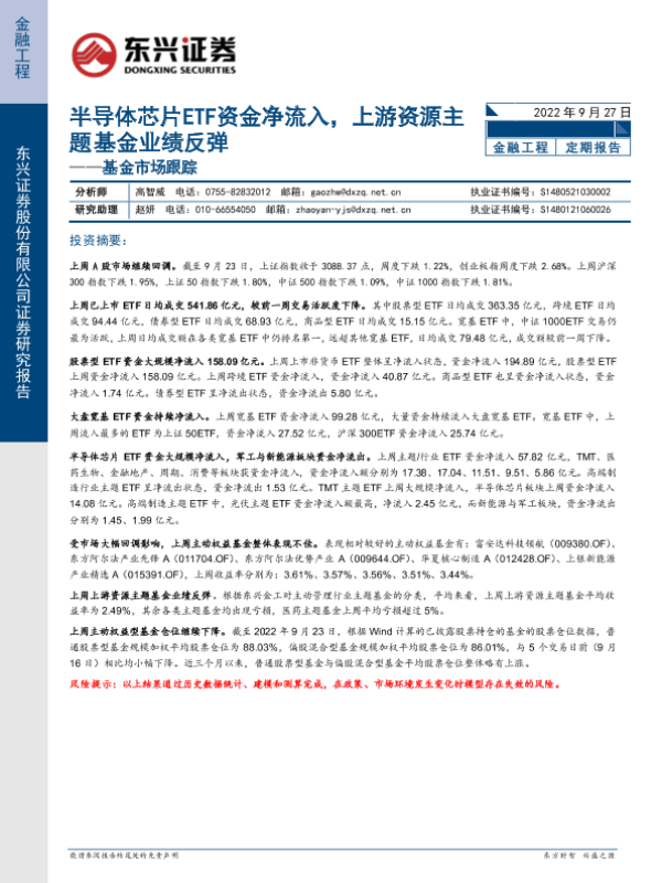 【东兴证券】【20220927】基金市场跟踪:半导体芯片ETF资金净流入,上游资源主题基金业绩反弹-19页 行业研究