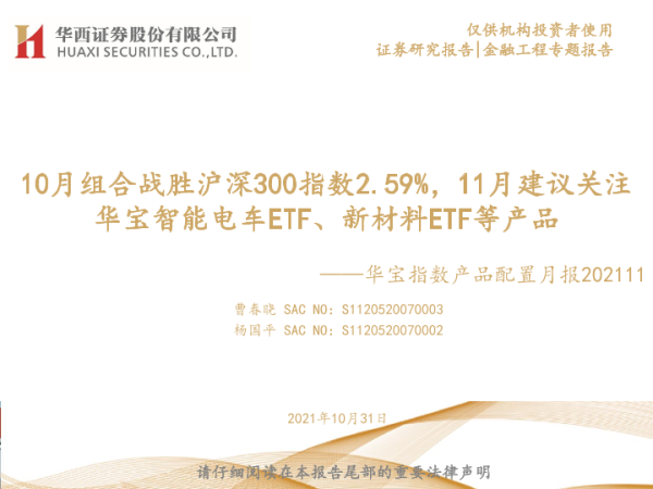 【华西证券】【20211031】华宝指数产品配置月报:10月组合战胜沪深300指数2.59%,11月建议关注华宝智能电车ETF、新材料ETF等产品-24页 行业研究