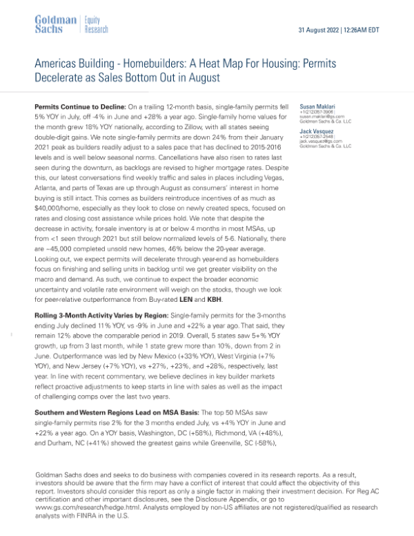 【Goldman Sachs】【20220831】A Heat Map For Housing Permits Decelerate as Sales Bottom Out in August-18页 行业研究