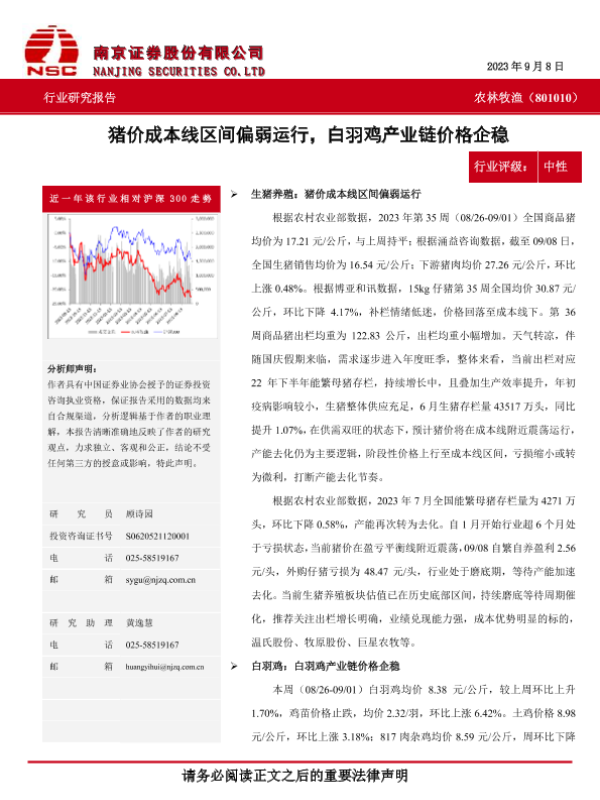 【南京证券】【20230908】猪价成本线区间偏弱运行,白羽鸡产业链价格企稳-11页 行业研究
