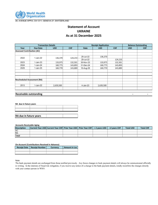 【世界卫生组织】【2025】Statement of Account UKRAINE As at 31 December 2025-1页 财报