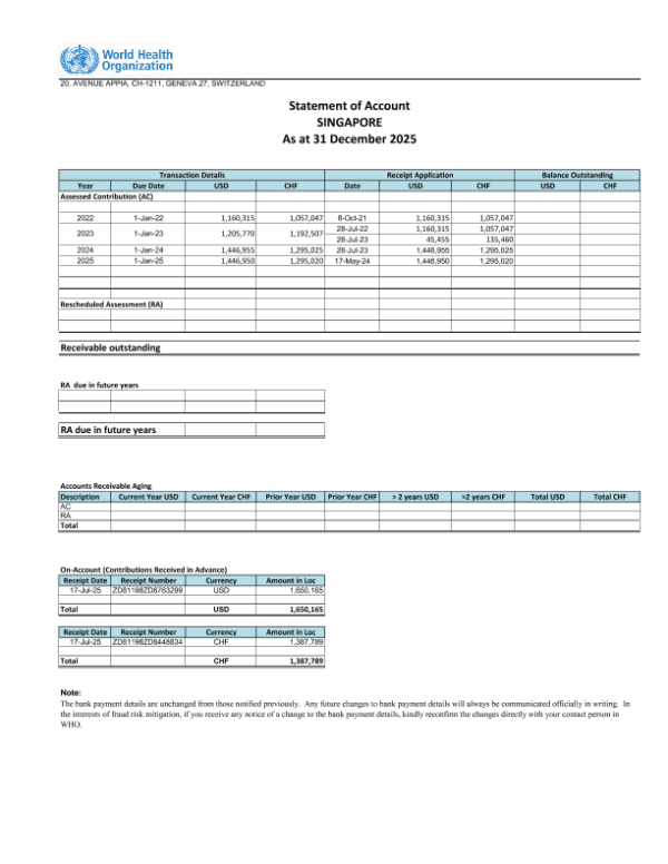 【世界卫生组织】【2025】Statement of Account SINGAPORE As at 31 December 2025-1页 财报