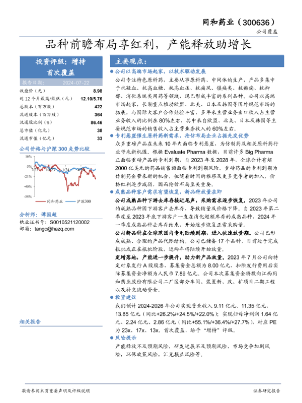 【华安证券】【20240722】同和药业(300636)品种前瞻布局享红利,产能释放助增长-21页 行业研究
