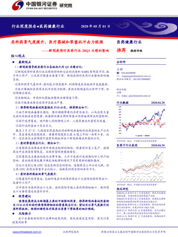 【银河证券】【20200501】新冠疫情对医药行业20Q1业绩的影响:原料药景气度提升,医疗器械和零售抗冲击力较强-23页 行业研究