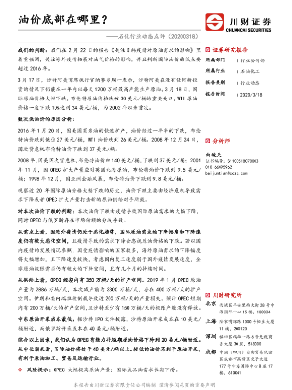 【川财证券】【20200318】石化行业动态点评:油价底部在哪里?-2页 证券期货研究报告