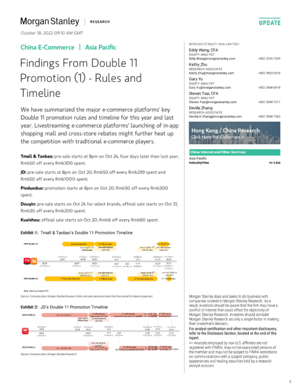 【Morgan Stanley】【20221018】中国电子商务双十一促销发现 (1) - 规则和时间表-10页 行业研究