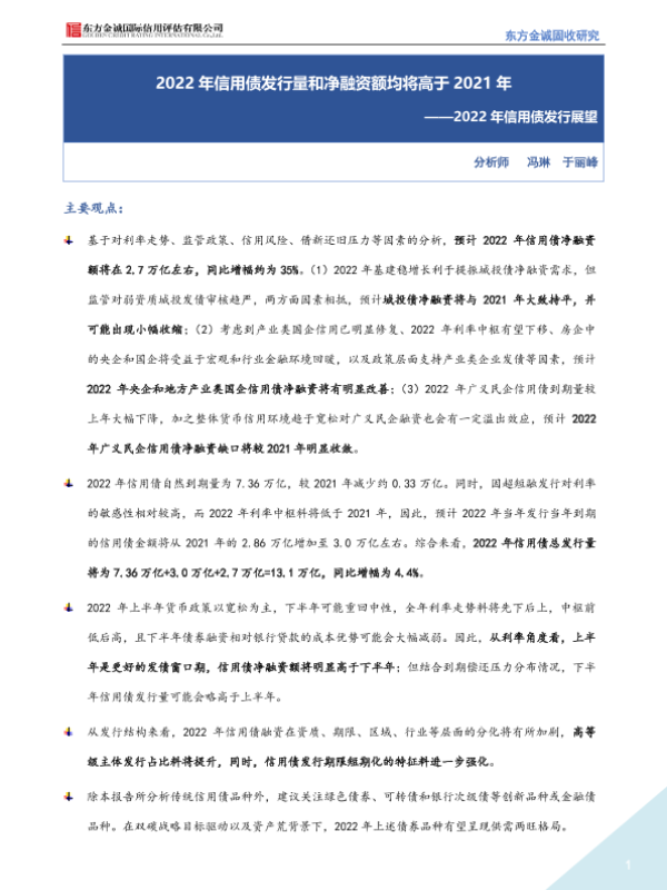【东方金诚】【20220124】2022年信用债发行展望:2022年信用债发行量和净融资额均将高于2021年-21页 行业研究