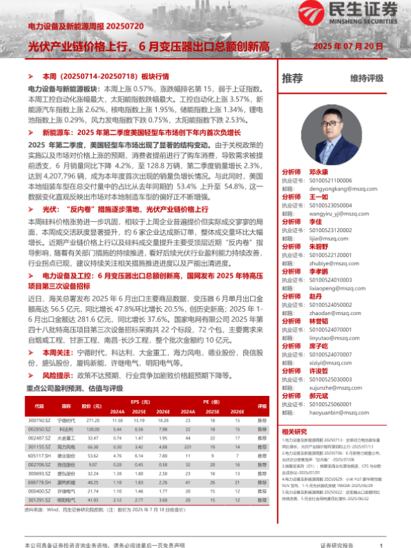 【民生证券】【20250720】电力设备及新能源周报:光伏产业链价格上行,6月变压器出口总额创新高-21页 证券期货研究报告