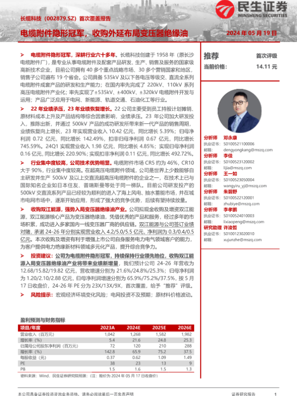 【民生证券】【20240519】长缆科技-电缆附件隐形冠军,收购外延布局变压器绝缘油-17页 行业研究