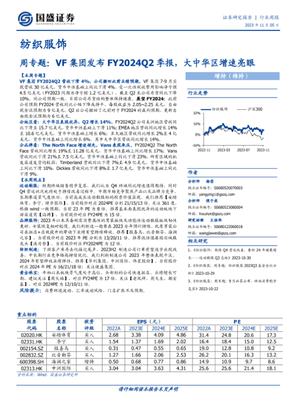 【国盛证券】【20231105】纺织服饰周专题:VF集团发布FY2024Q2季报,大中华区增速亮眼-21页 行业研究