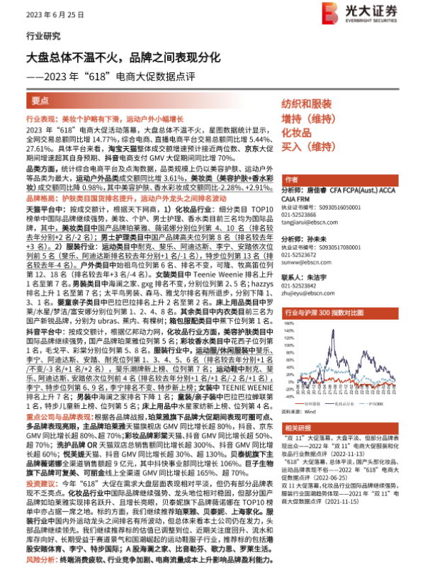 【光大证券】【20230625】纺织和服装行业2023年“618”电商大促数据点评:大盘总体不温不火,品牌之间表现分化-10页 行业研究