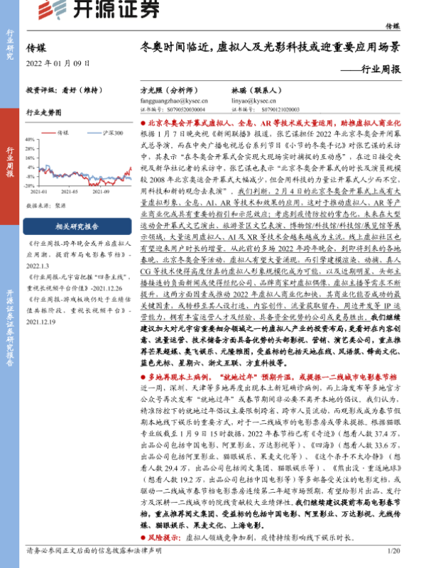 【开源证券】【20220109】20220109-开源证券-传媒行业周报:冬奥时间临近,虚拟人及光影科技或迎重要应用场景-20页 行业研究