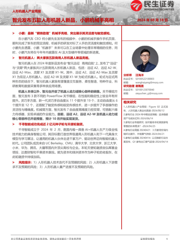 【民生证券】【20240818】人形机器人产业周报:智元发布五款人形机器人新品,小鹏机械手亮相-10页 行业研究
