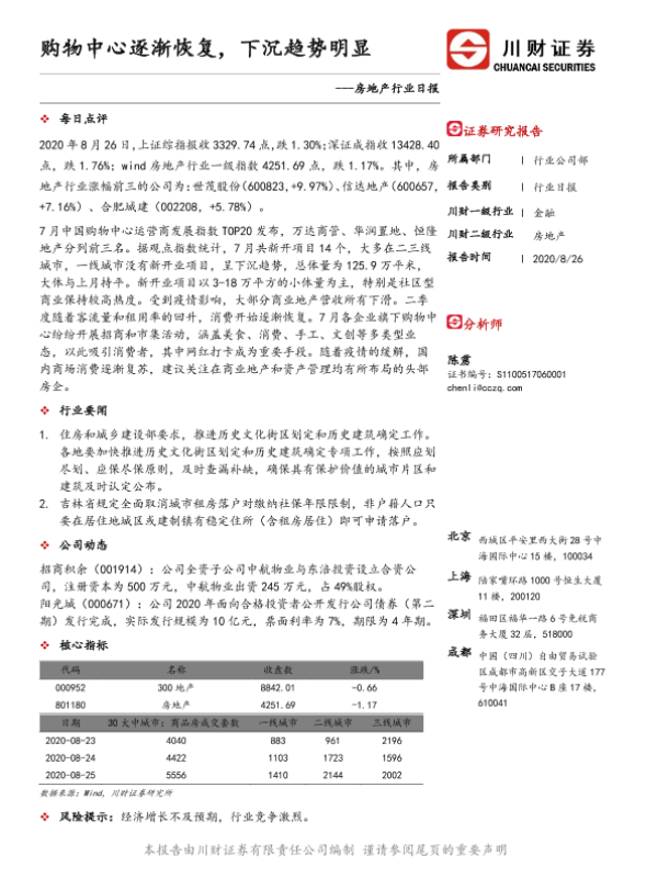 【川财证券】【20200826】房地产行业日报:购物中心逐渐恢复,下沉趋势明显-3页 证券期货研究报告