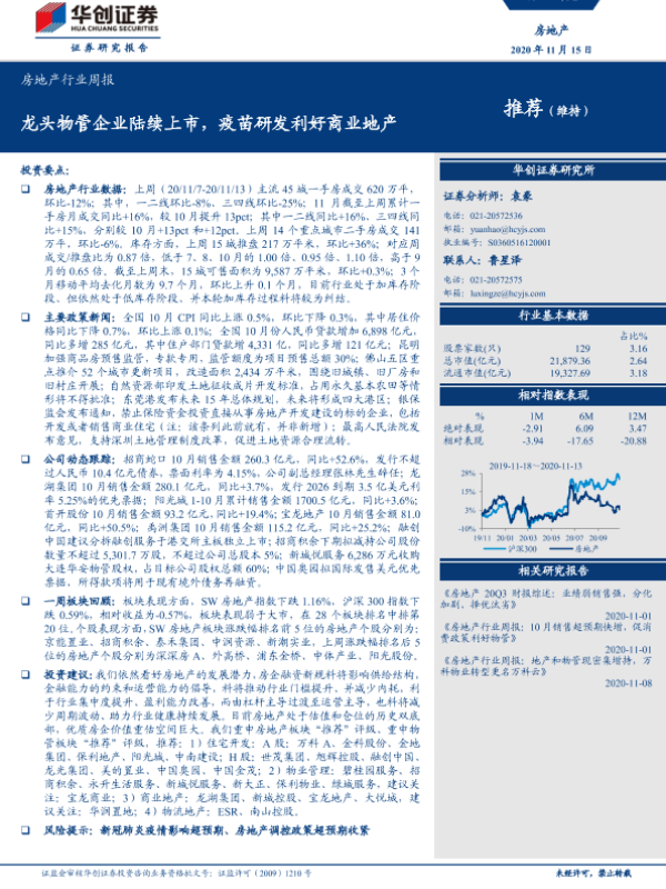 【华创证券】【20201115】龙头物管企业陆续上市,疫苗研发利好商业地产-20页 行业研究
