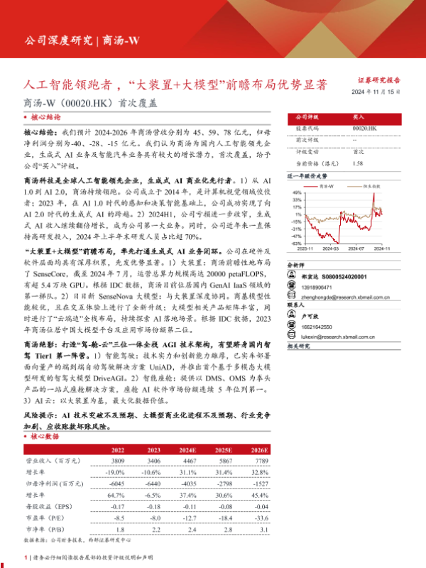 【西部证券】【20241115】商汤-W(0020.HK)首次覆盖:人工智能领跑者,“大装置+大模型”前瞻布局优势显著-28页 行业研究