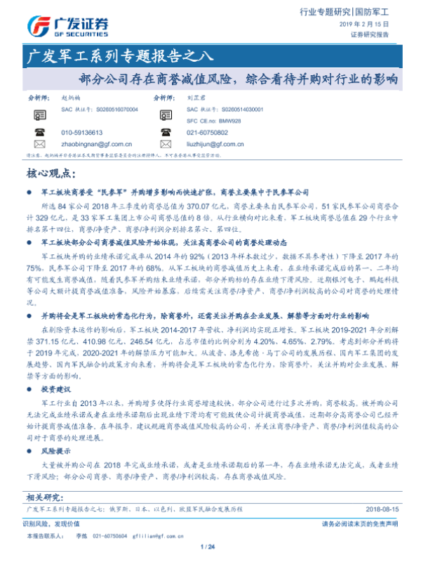 【广发证券】【20190215】广发军工系列专题报告之八:部分公司存在商誉减值风险,综合看待并购对行业的影响-24页 行业研究