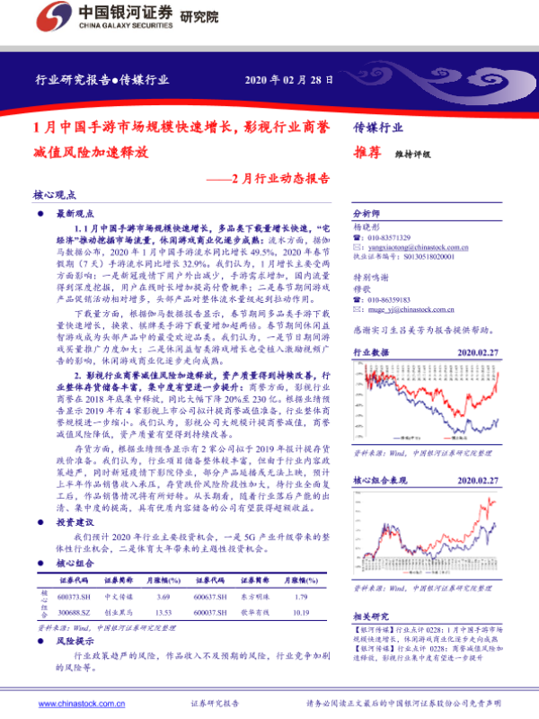 【银河证券】【20200228】2月行业动态报告:1月中国手游市场规模快速增长,影视行业商誉减值风险加速释放-45页 行业研究