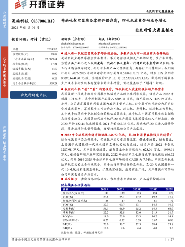 【开源证券】【20240104】北交所首次覆盖报告:稀缺性航空器装备零部件供应商,四代机放量带动业务增长-27页 行业研究