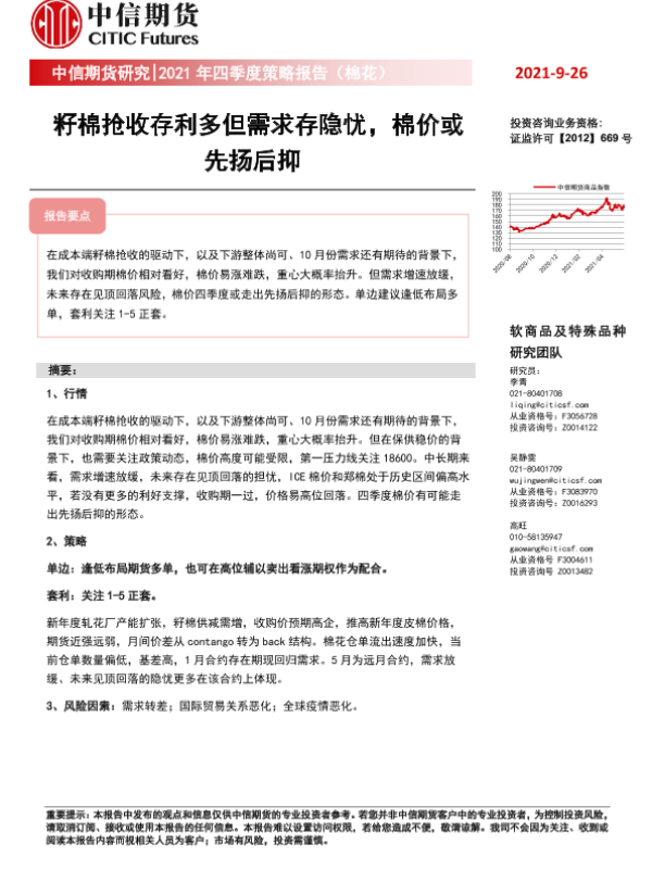 【中信期货】【20210926】2021年四季度策略报告(棉花):籽棉抢收存利多但需求存隐忧,棉价或先扬后抑-20页 行业研究