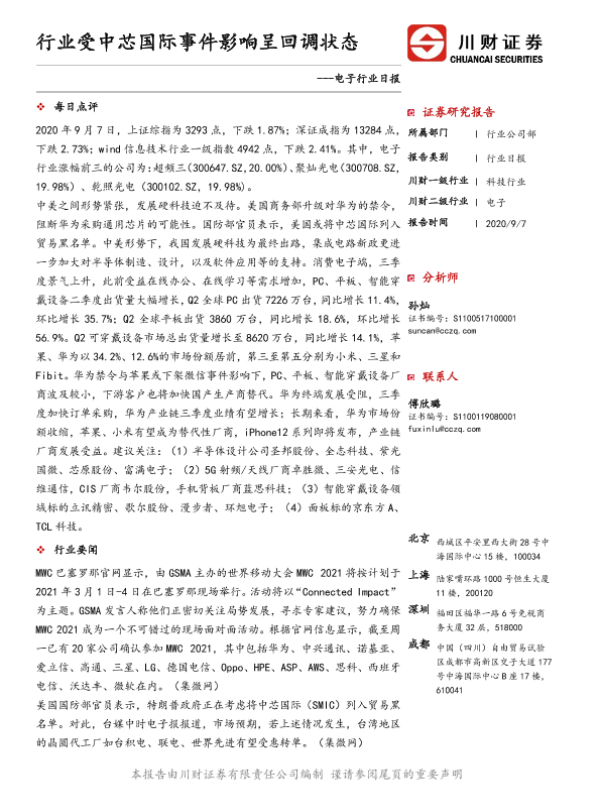 【川财证券】【20200907】电子行业日报:行业受中芯国际事件影响呈回调状态-5页 证券期货研究报告