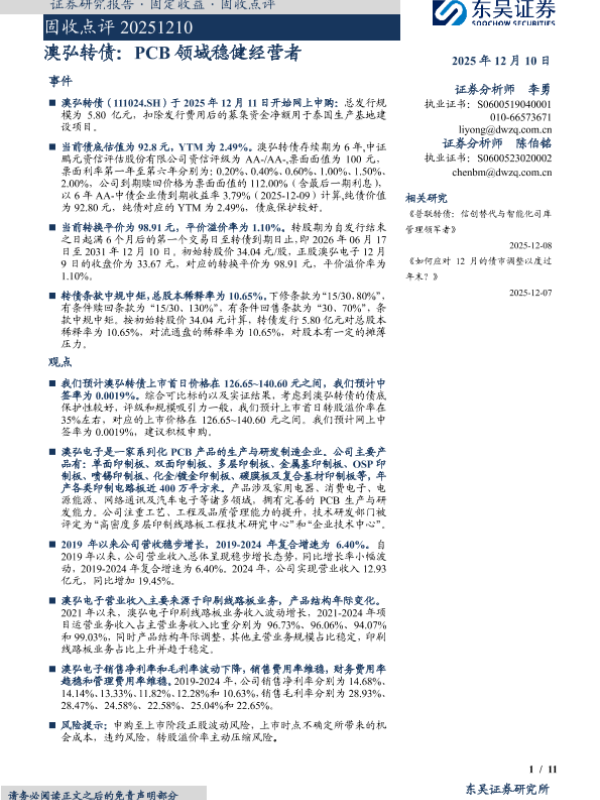 【东吴证券】【202512】澳弘转债:PCB领域稳健经营者-11页 证券期货研究报告