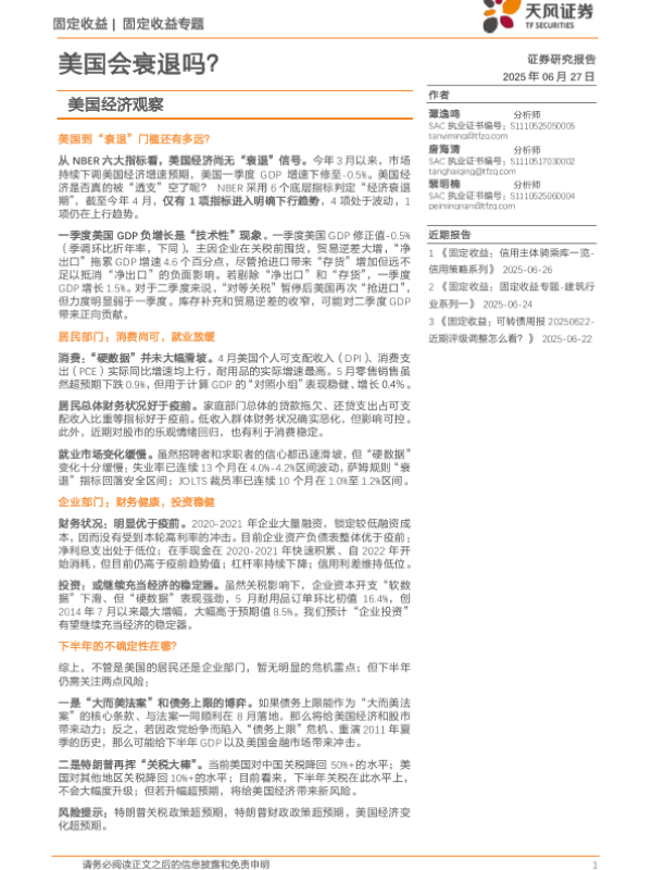 【天风证券】【20250627】美国经济观察:美国会衰退吗?-14页 证券期货研究报告