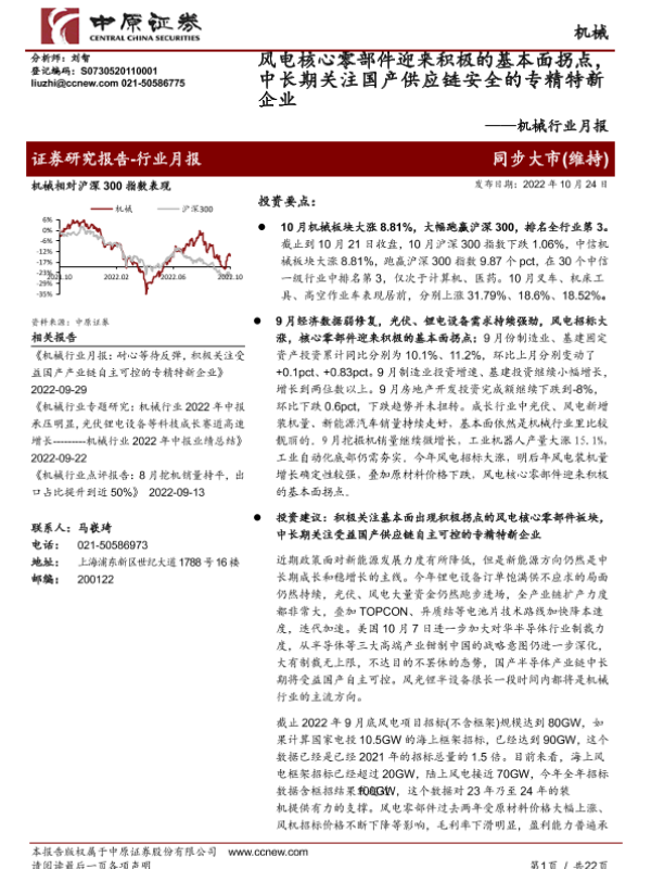 【中原证券】【20221024】机械行业月报:风电核心零部件迎来积极的基本面拐点,中长期关注国产供应链安全的专精特新企业-22页 行业研究