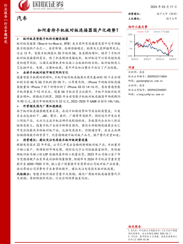 【国联证券】【20240317】汽车行业专题研究:如何看待手机板对板连接器国产化趋势?-10页 行业研究