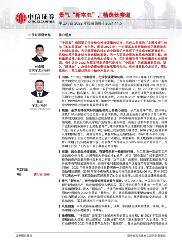【中信证券】【20211105】军工行业2022年投资策略:景气“新常态”,精选长赛道-28页 行业研究