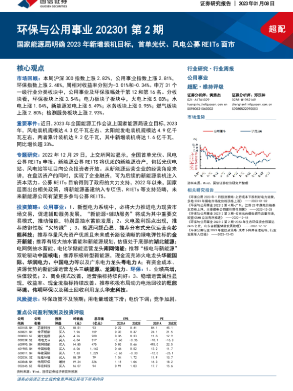 【国信证券】【20230108】环保与公用事业202301第2期:国家能源局明确2023年新增装机目标,首单光伏、风电公募REITs面市-29页 行业研究