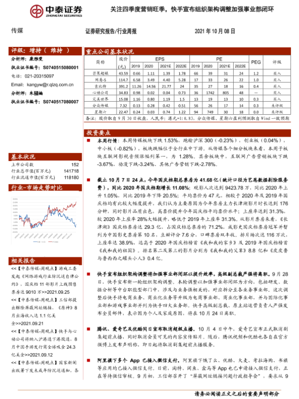 【中泰证券】【20211008】20211008-中泰证券-传媒行业周报:关注四季度营销旺季,快手宣布组织架构调整加强事业部闭环-13页 行业研究