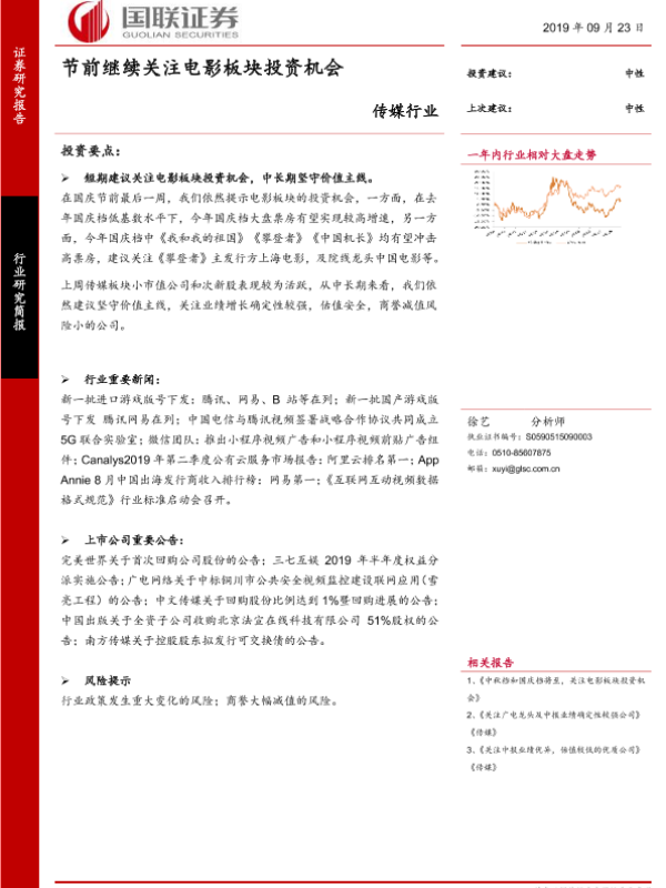 【国联证券】【20190923】传媒行业:节前继续关注电影板块投资机会-8页 行业研究