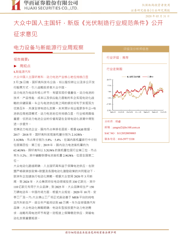 【华西证券】【20200531】电力设备与新能源行业周观察:大众中国入主国轩,新版《光伏制造行业规范条件》公开征求意见-19页 行业研究