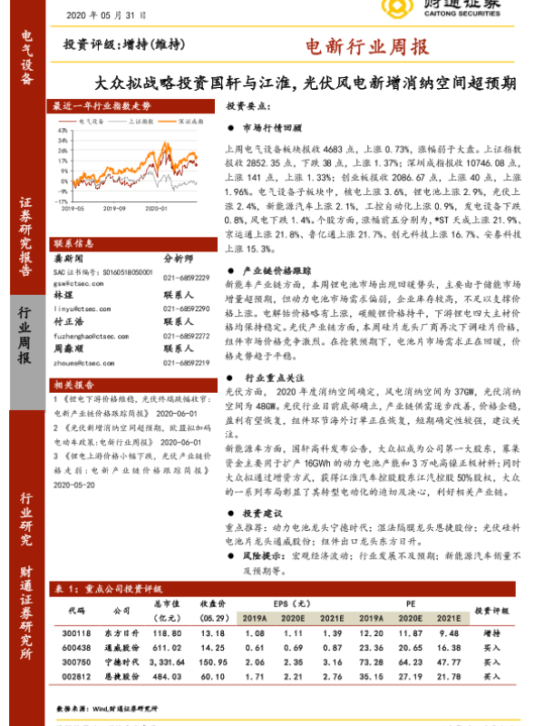 【财通证券】【20200531】电新行业周报:大众拟战略投资国轩与江淮,光伏风电新增消纳空间超预期-13页 行业研究
