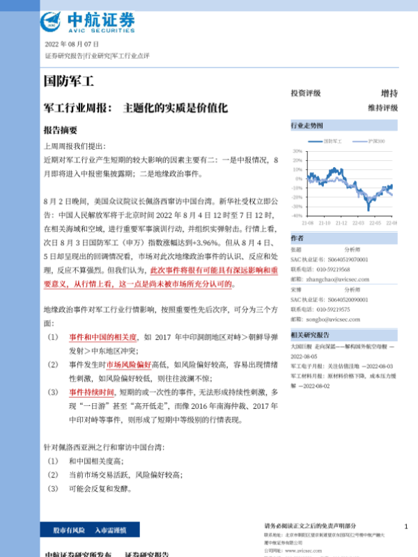 【中航证券】【20220807】军工行业周报 主题化的实质是价值化-24页 行业研究