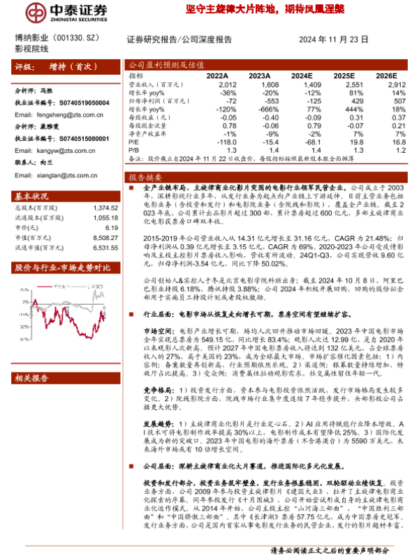 【中泰证券】【20241123】博纳影业(001330)坚守主旋律大片阵地,期待凤凰涅槃-32页 行业研究