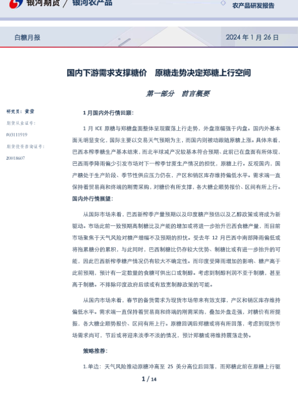 【银河期货】【20240126】白糖月报:国内下游需求支撑糖价 原糖走势决定郑糖上行空间-14页 行业研究