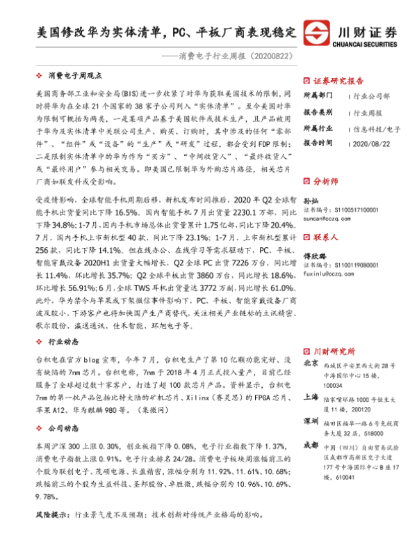 【川财证券】【20200822】20200822-川财证券-消费电子行业周报:美国修改华为实体清单,PC、平板厂商表现稳定-10页 行业研究