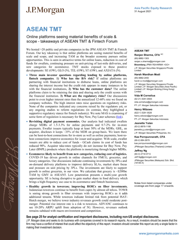 【J.P. Morgan】【20210831】在线平台看到了规模和范围的实质性好处:东盟TMT和金融科技论坛的收获-29页 行业研究