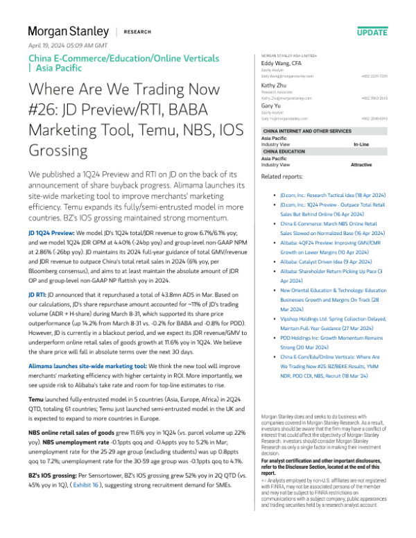【Morgan Stanley】【20240418】中国电子商务、教育及在线垂直领域现状#26:JD预览/RTI,阿里妈妈营销工具,Temu,NBS,iOS收入-14页 行业研究