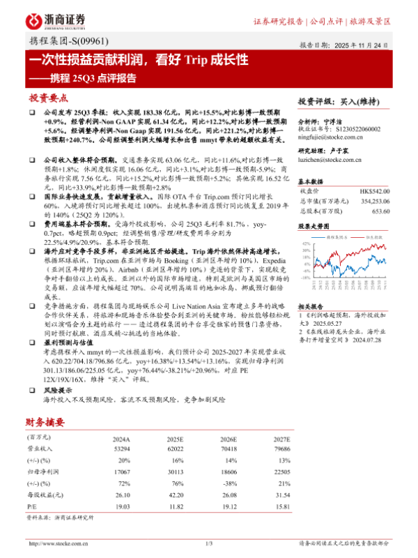 【浙商证券】【202511】一次性损益贡献利润,看好 Trip成长性——携程 25Q3点评报告-3页 证券期货研究报告