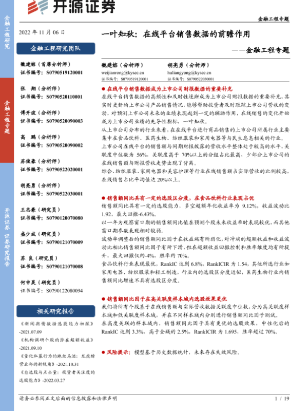【开源证券】【20221106】金融工程专题:一叶知秋,在线平台销售数据的前瞻作用-19页 行业研究