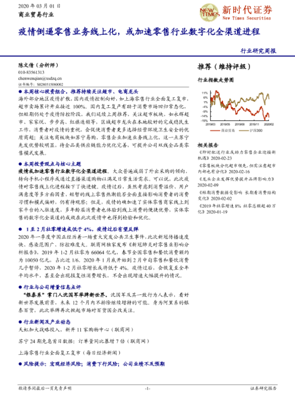 【新时代证券】【20200301】商业贸易行业研究周报:疫情倒逼零售业务线上化,或加速零售行业数字化全渠道进程-14页 行业研究