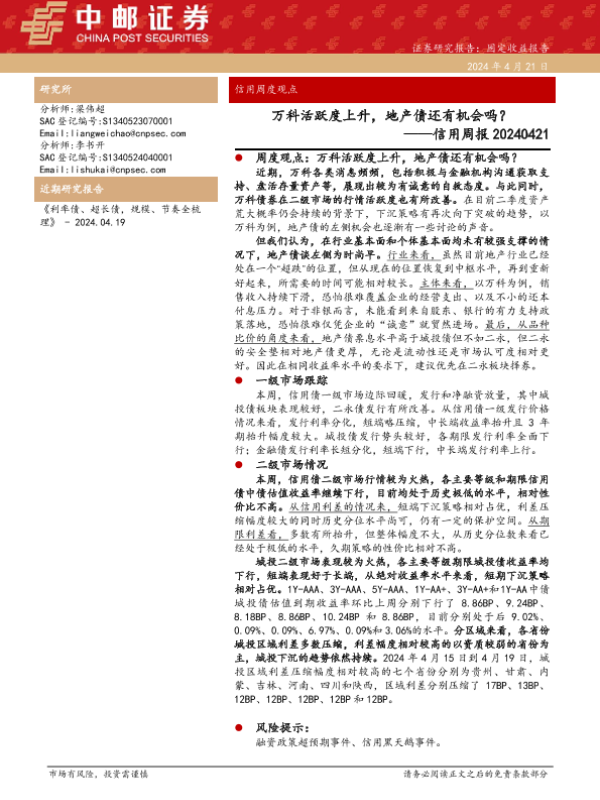 【中邮证券】【20240421】信用:万科活跃度上升,地产债还有机会吗?-17页 行业研究
