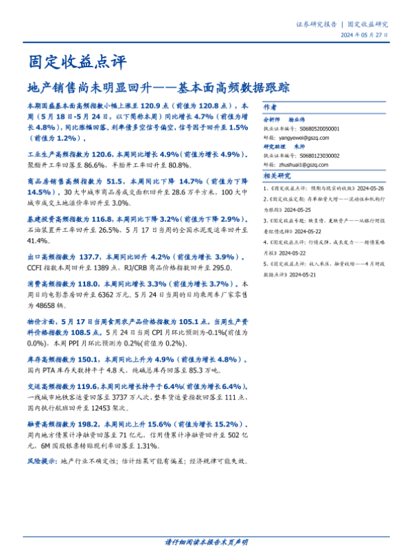 【国盛证券】【20240527】固定收益点评:基本面高频数据跟踪,地产销售尚未明显回升-19页 行业研究