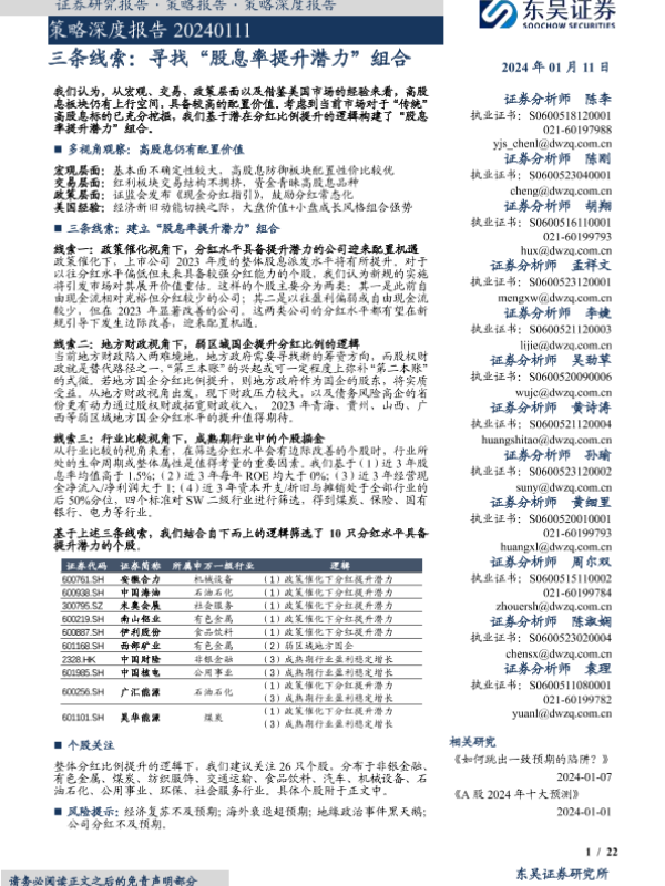 【东吴证券】【20240111】策略深度报告:三条线索:寻找“股息率提升潜力”组合-22页 行业研究