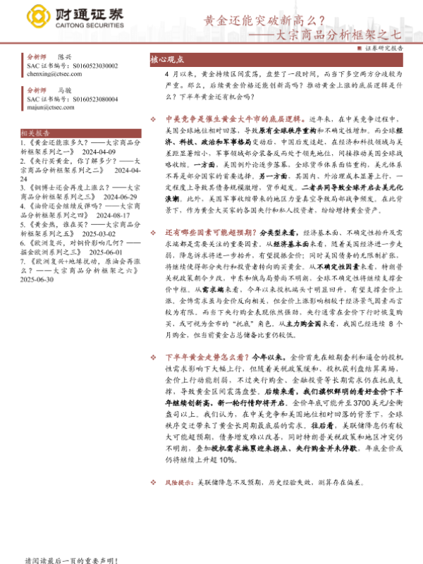 【财通证券】【20250721】大宗商品分析框架之七:黄金还能突破新高么?-15页 证券期货研究报告