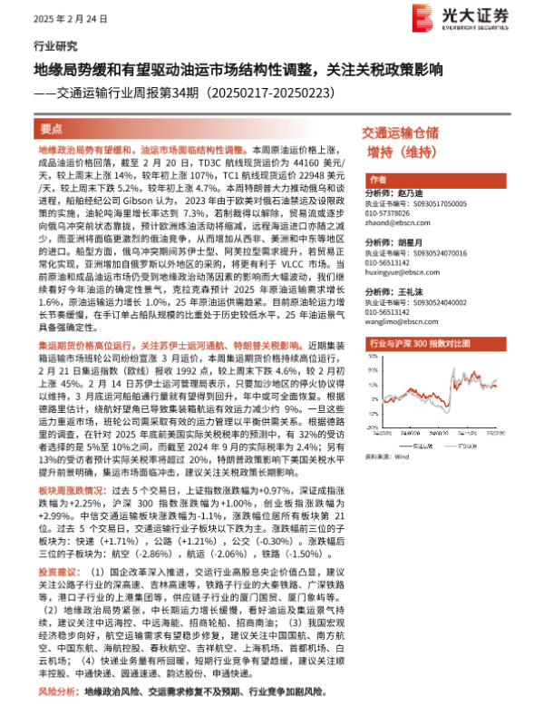 【光大证券】【20250224】交通运输行业周报第34期:地缘局势缓和有望驱动油运市场结构性调整,关注关税政策影响-15页 行业研究